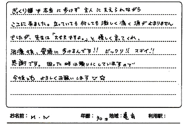 ぎっくり腰で本当に歩けず主人に支えられながらここに来ました。 立っていても何しても激しく痛く涙が止まりませんでしたが、先生は「大丈夫ですよ。」と優しく言ってくれ、 施術後、普通に歩けるんです!!ビックリ!!スゴイ!!感謝です。 困った時は頼りにしていますので今後ともよろしくお願いします☆