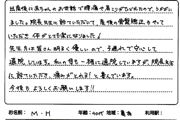 出産後に赤ちゃんのお世話で腰痛や肩こりがひどかったので、伺いました。 先生に施術していただいて産後の骨盤矯正もやっていただき、体がとても楽になりました! 先生方は皆さん明るく優しいので、子連れで安心して通院しています。 私の母も一緒に通院していますが、先生に診ていただき、痛みがとれる!と喜んでいます。 今後もよろしくお願いします!!