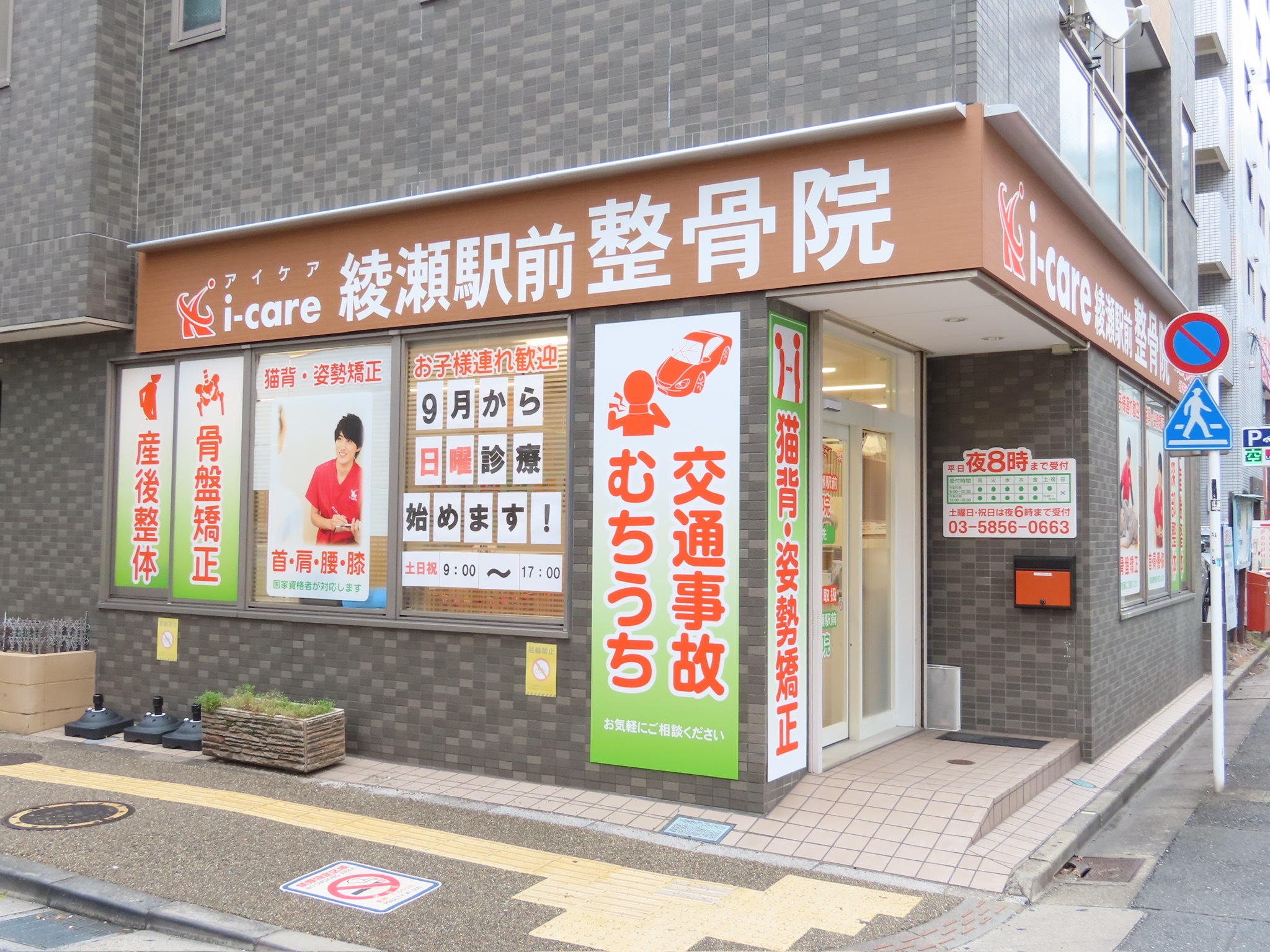 i-care綾瀬駅前整骨院は、綾瀬駅から徒歩1分の場所にあります。
