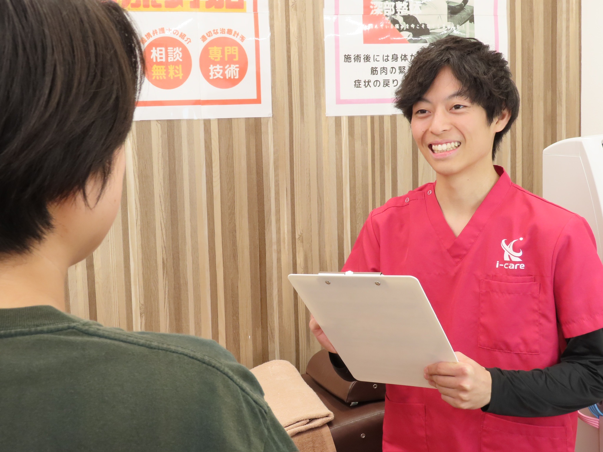 i-care綾瀬駅前整骨院では、お一人ずつ丁寧にカウンセリング・検査を行い、お悩みやお身体の状態を把握した上で施術をし、痛みの解消だけではなく、痛みを繰り返さない根本治療・身体作りを目指します。